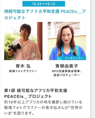 ※現地の人たちと共に、自力で生きる為の事業を立ち上げるべく尽力される青木弘カメラマンとオンラインで結び「写真」を通して「平和」を考えインタビュー講演の模様を全世界に配信した。